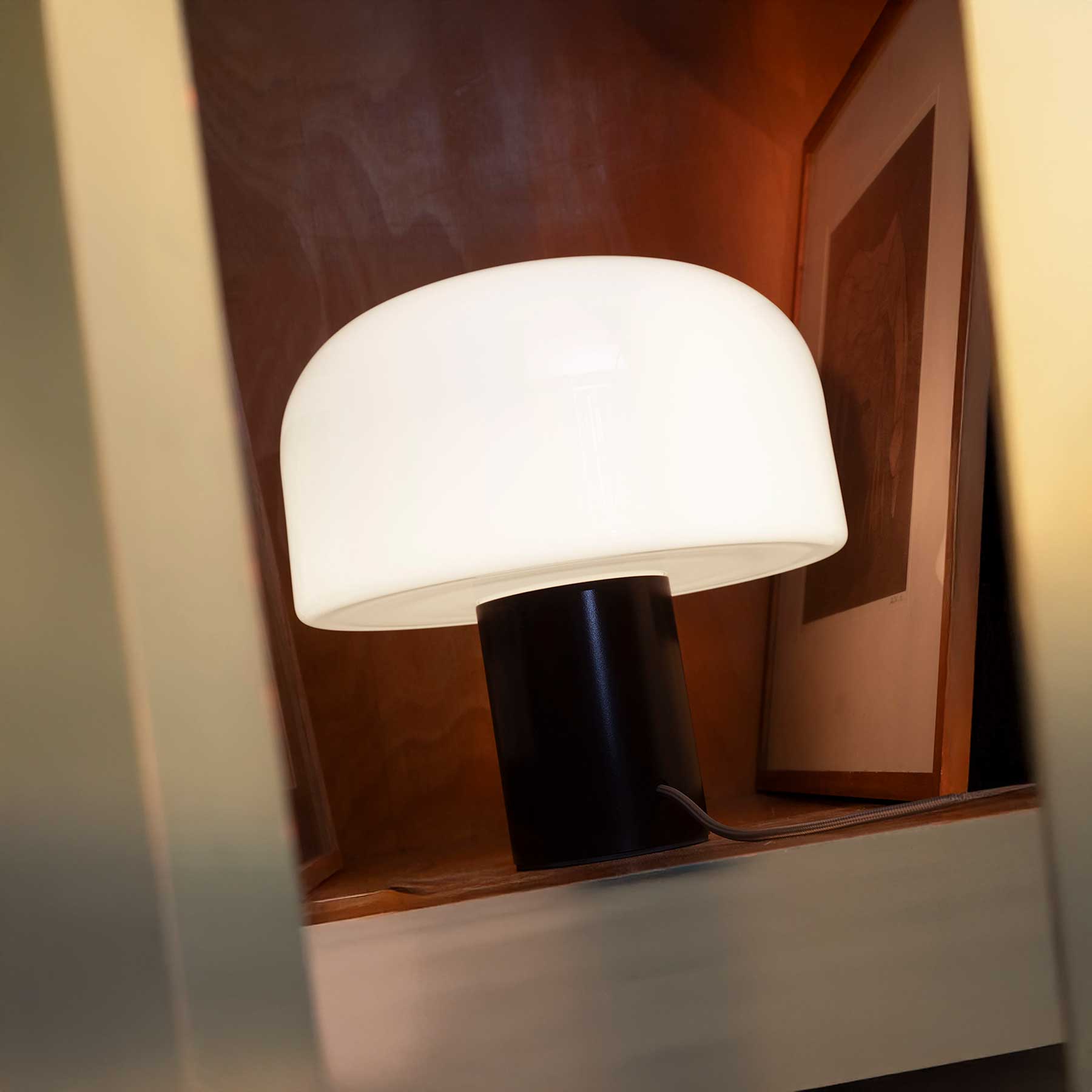 Az olasz Flos cég Bellhop Glass T nagyméretű asztali lámpája elegáns kivitelezésével és minőségi fényszórásával tűnik ki. Kupola alakú diffúzora három réteg opálüvegből készült, a fehér réteg két egyidejűleg fújt átlátszó üvegréteg közé van beékelve. Az egyes rétegek vastagsága eltérő, hozzájárulva a fény optikai mélységéhez és minőségéhez. Ez a kifinomult kialakítás a Flos fejlesztési részlegével együttműködve jött létre, és méretének köszönhetően egyenletes, meleg és kellemes világítást tesz lehetővé, amely hangulatos légkört teremt a térben. A Bellhop Glass T változat 33 cm átmérőjű, 12 cm átmérőjű hengeres alumínium alapon áll, és világos alumínium, cioko és fehér színben kapható. A lámpa anyagai nemcsak vizuálisan vonzóak, hanem teljes mértékben újrahasznosíthatóak is, ami megerősíti a Flos fenntarthatóság iránti elkötelezettségét.