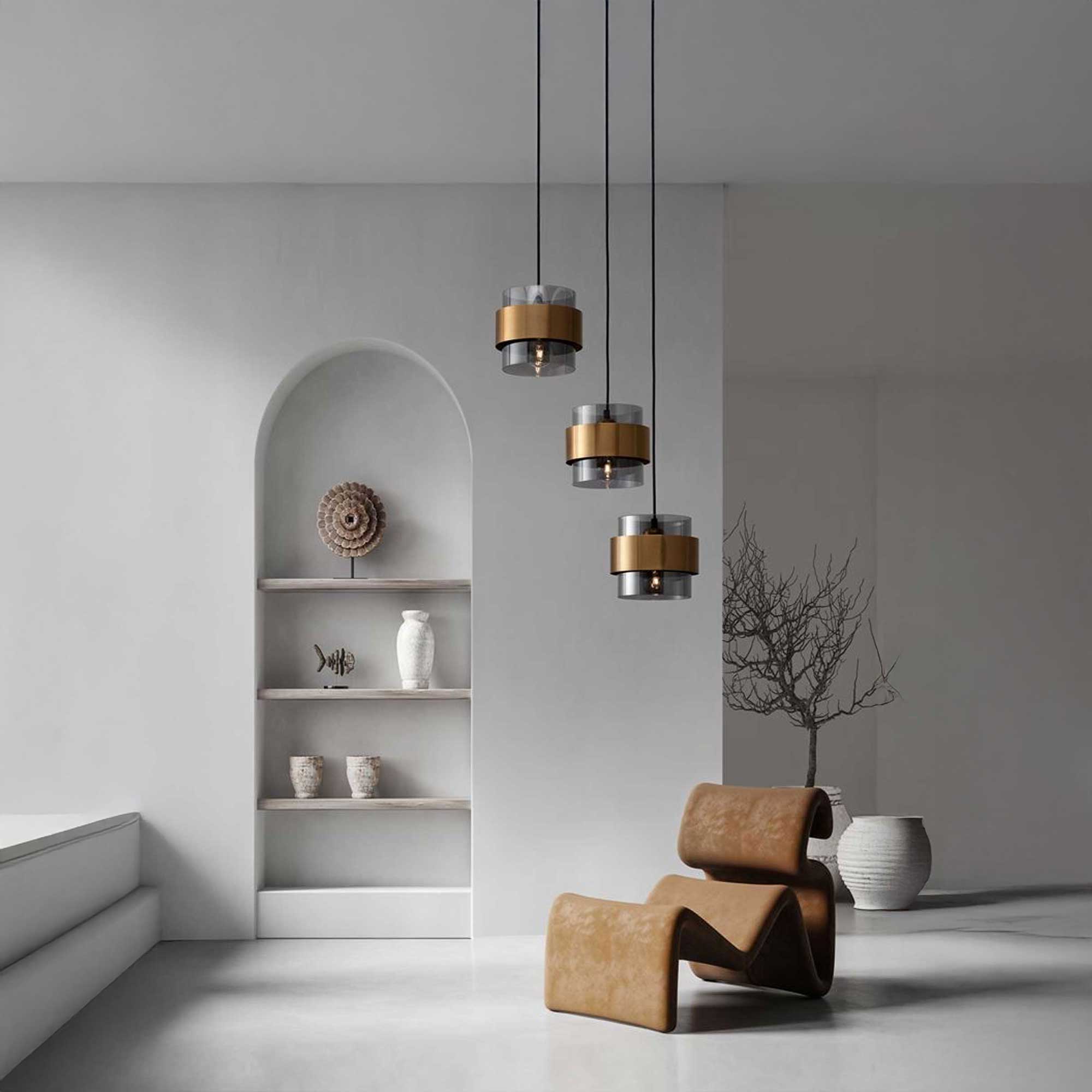 A görög Nova Luce cég Sianna függőlámpa-csoportja három, egy kör alakú baldachinra függesztett lámpatest hatását kelti, amelyek együttesen egy lenyűgöző fényobjektumot alkotnak egy időtlen belső térben. Mindegyik lámpatest füstölt üvegből készült, aranyszínű fémszalaggal, ami az egész összeállításnak luxus dizájnjelleget kölcsönöz. Minden egyes lámpa magassága külön-külön állítható, így könnyen létrehozható szimmetrikus kompozíció vagy dinamikus kaszkádszerű elrendezés. A fényforrást E27-es foglalatú izzóval tervezték, így rugalmasan megválaszthatja a fénytípust a tér hangulatának megfelelően - a melegebb pihenéstől a világosabb munkavégzésig. A Cluster Sianna ideális megoldás az étkezőasztal fölött, a nappaliban, a fogadószobában vagy a konyhasziget fölött, ahol jellegzetes, mégis elegáns elemként funkcionál.